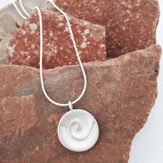 This Sterling Silver spiral necklace is a study in beautiful simplicity. The slightly concave pendant features a single raised-relief spiral. Paired with the included Sterling chain, you will feel the interconnectedness of all things.
